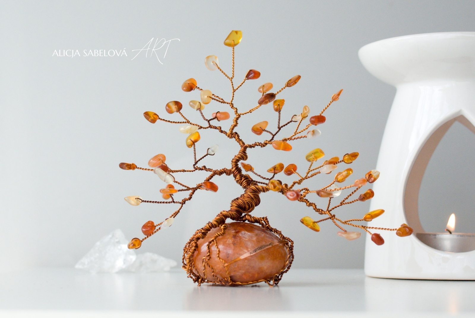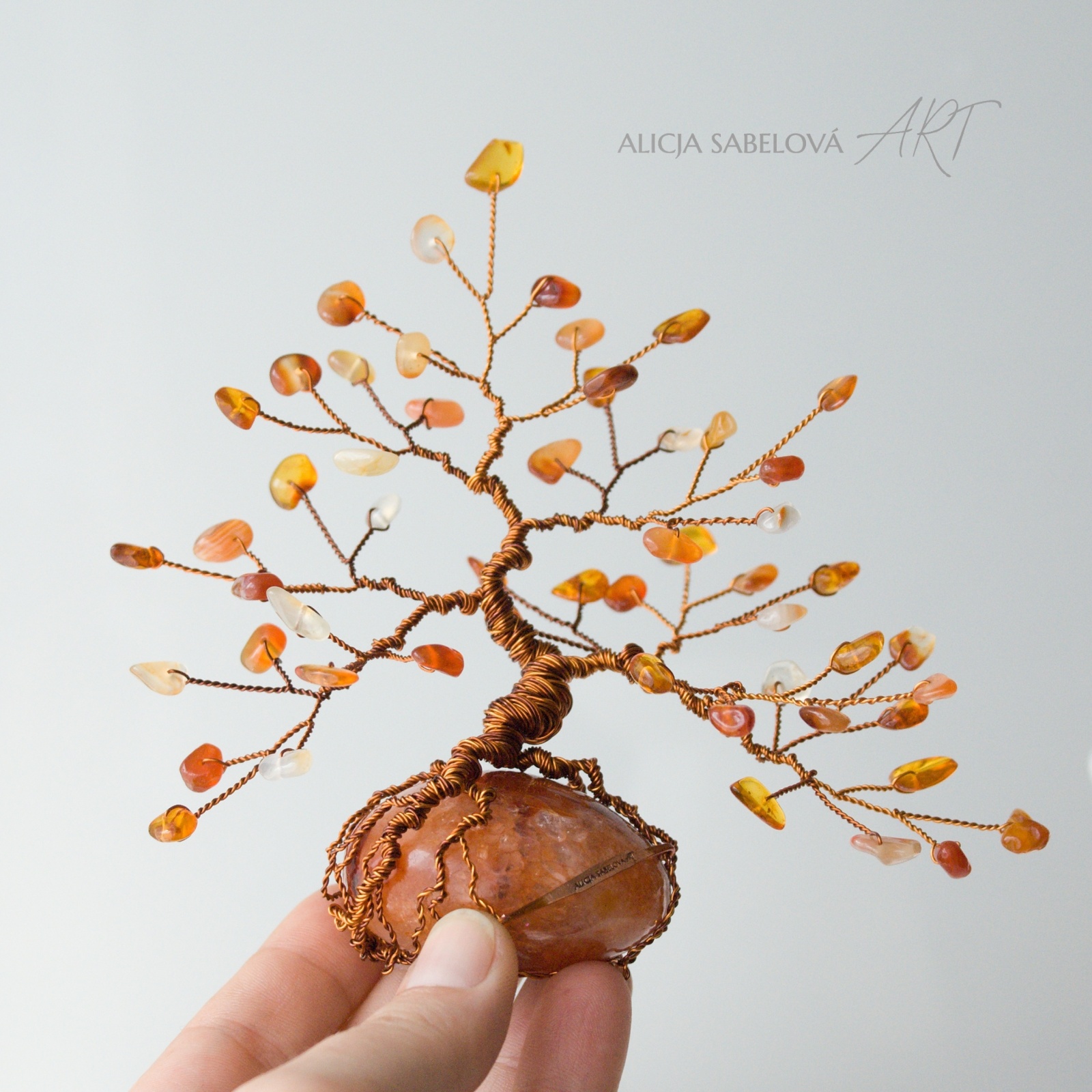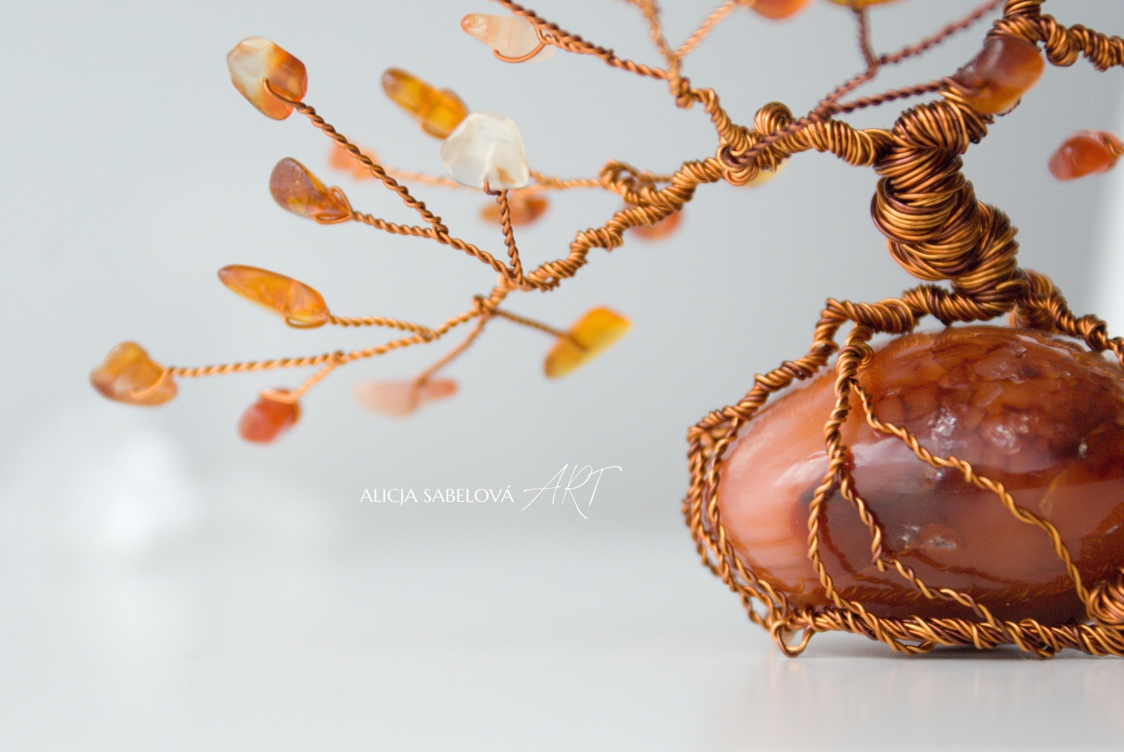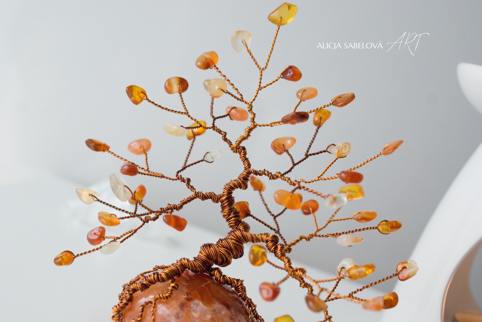 Tento autorský strom z minerálů tvořený podle principu zlatého řezu vyrostl na nádherném Karneolu do výšky 15 cm.