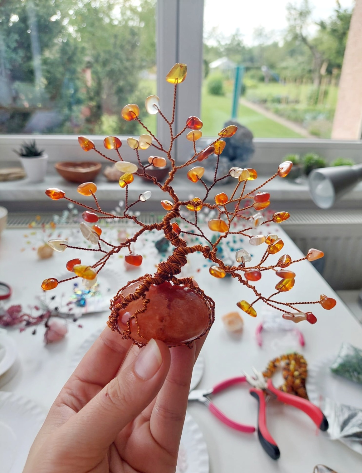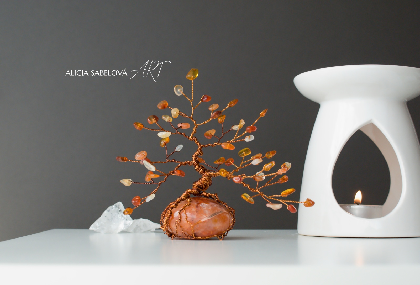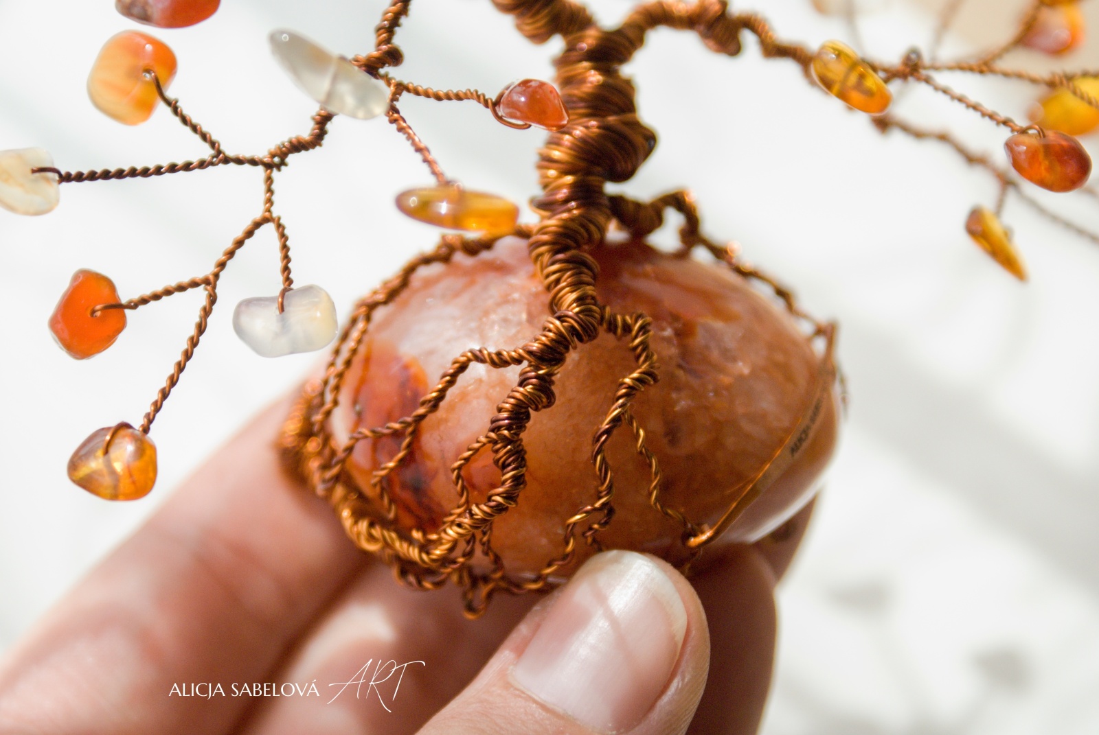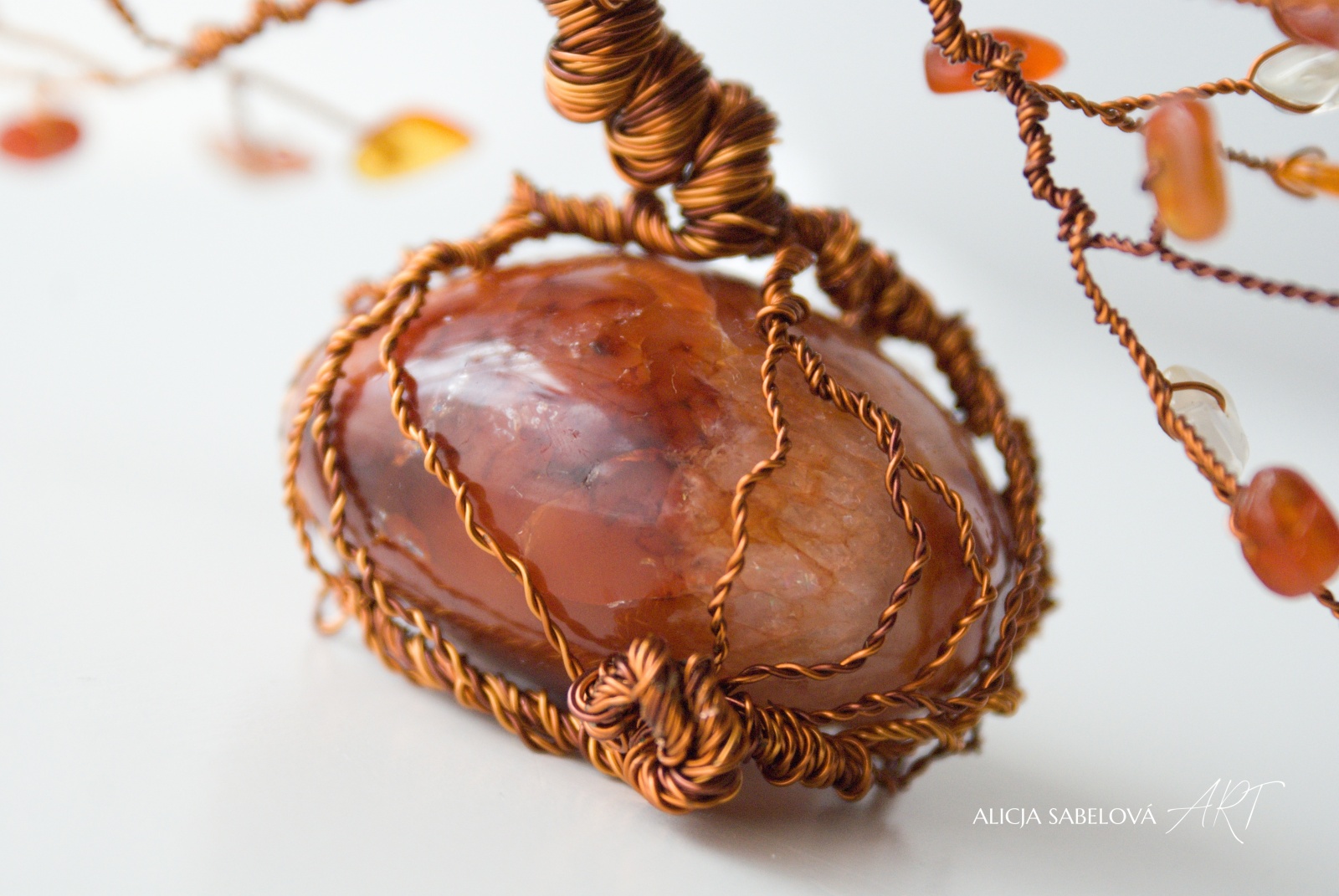 Tento autorský strom z minerálů tvořený podle principu zlatého řezu vyrostl na nádherném Karneolu do výšky 15 cm.