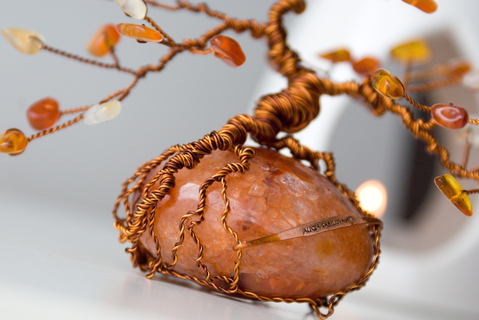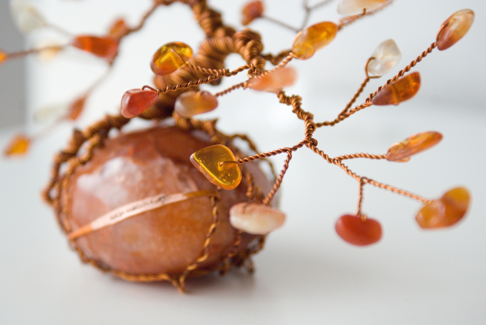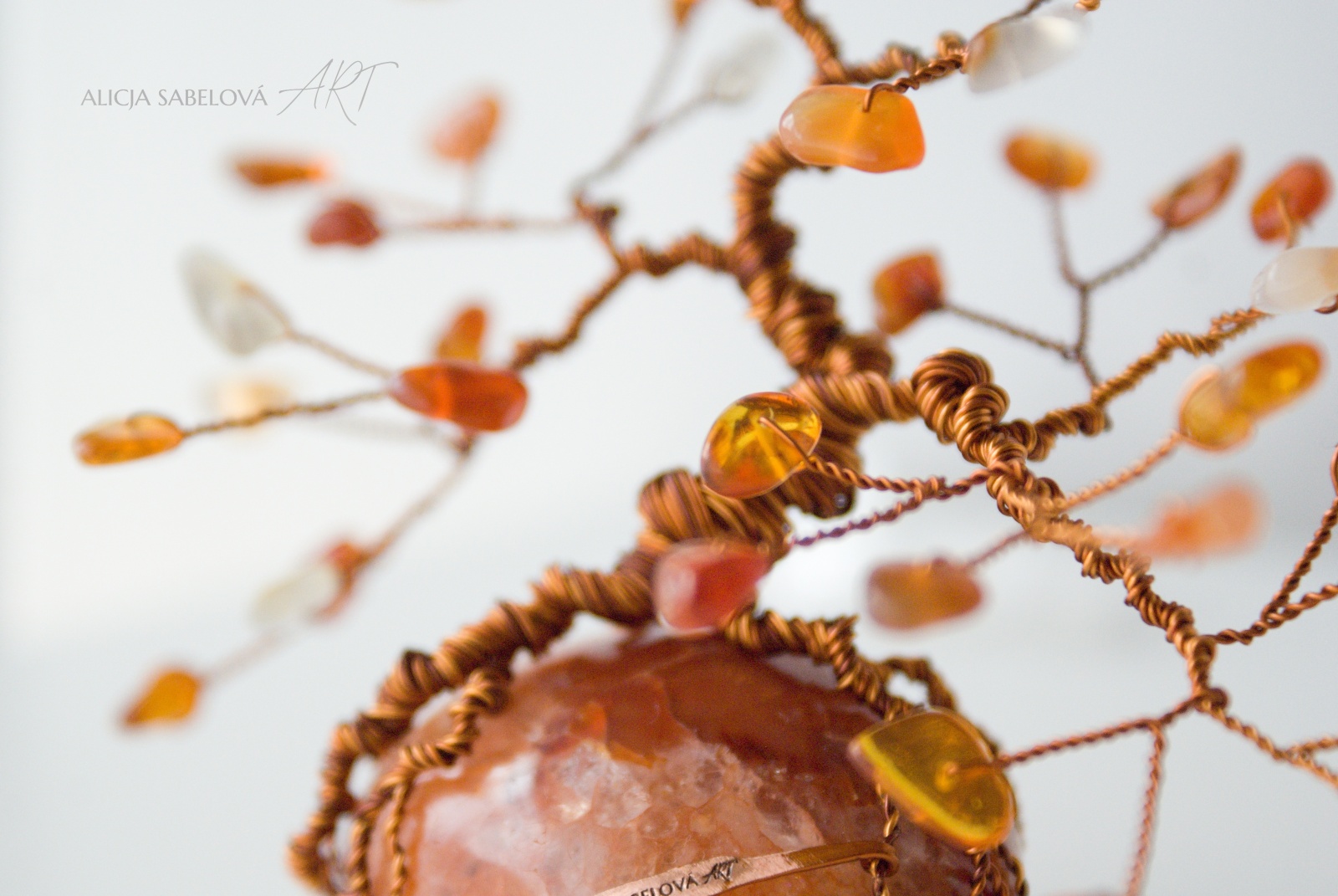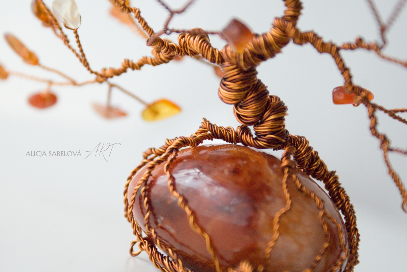 Korunu tvoří Karneol a Jantar. Kmen je vyrobený z měděného drátu, který je lakovaný a nemění tedy barvu.