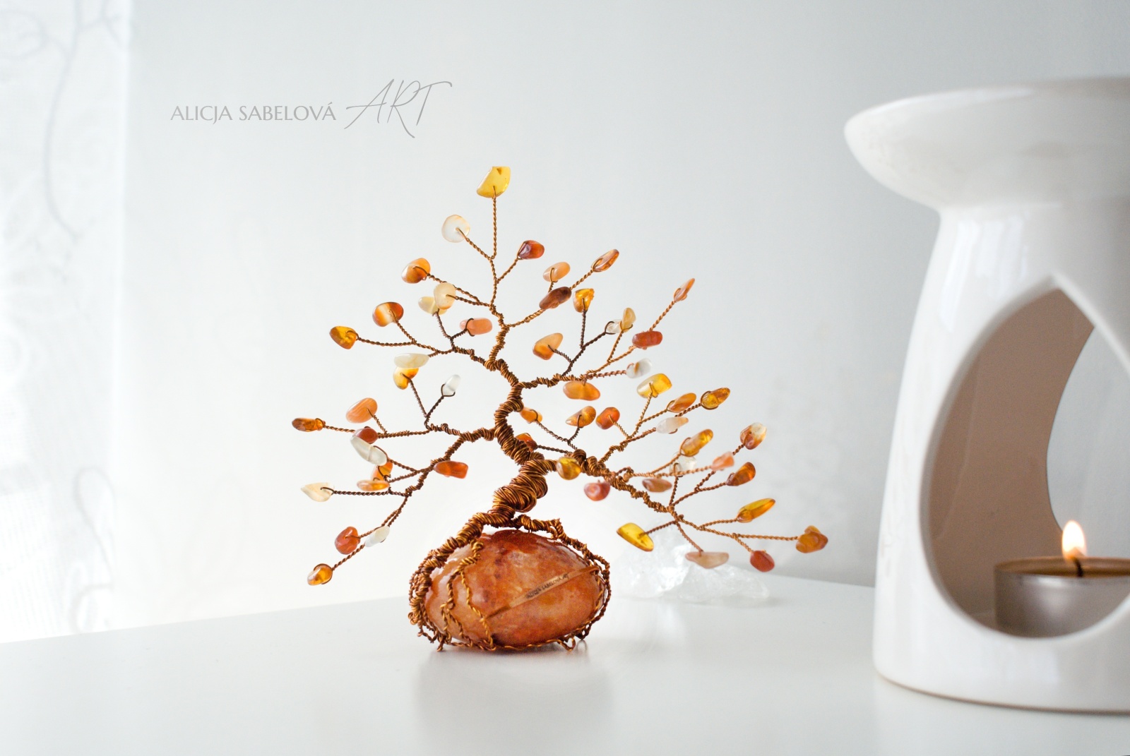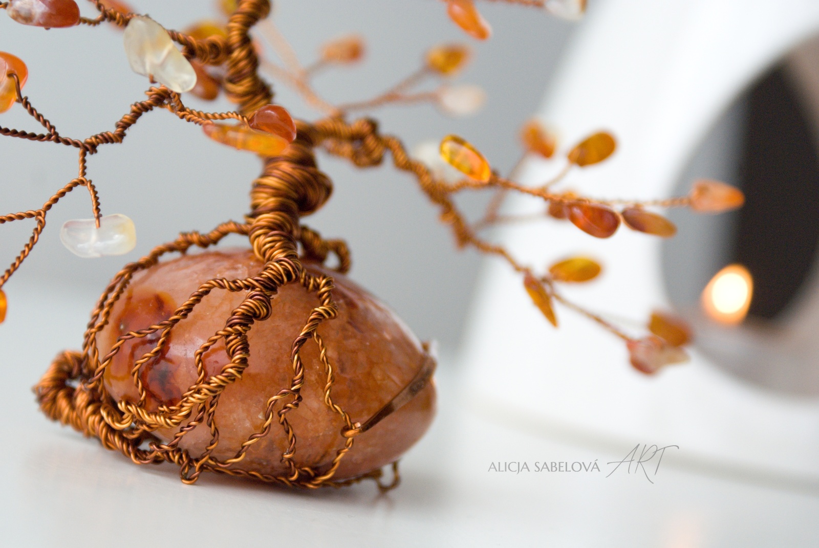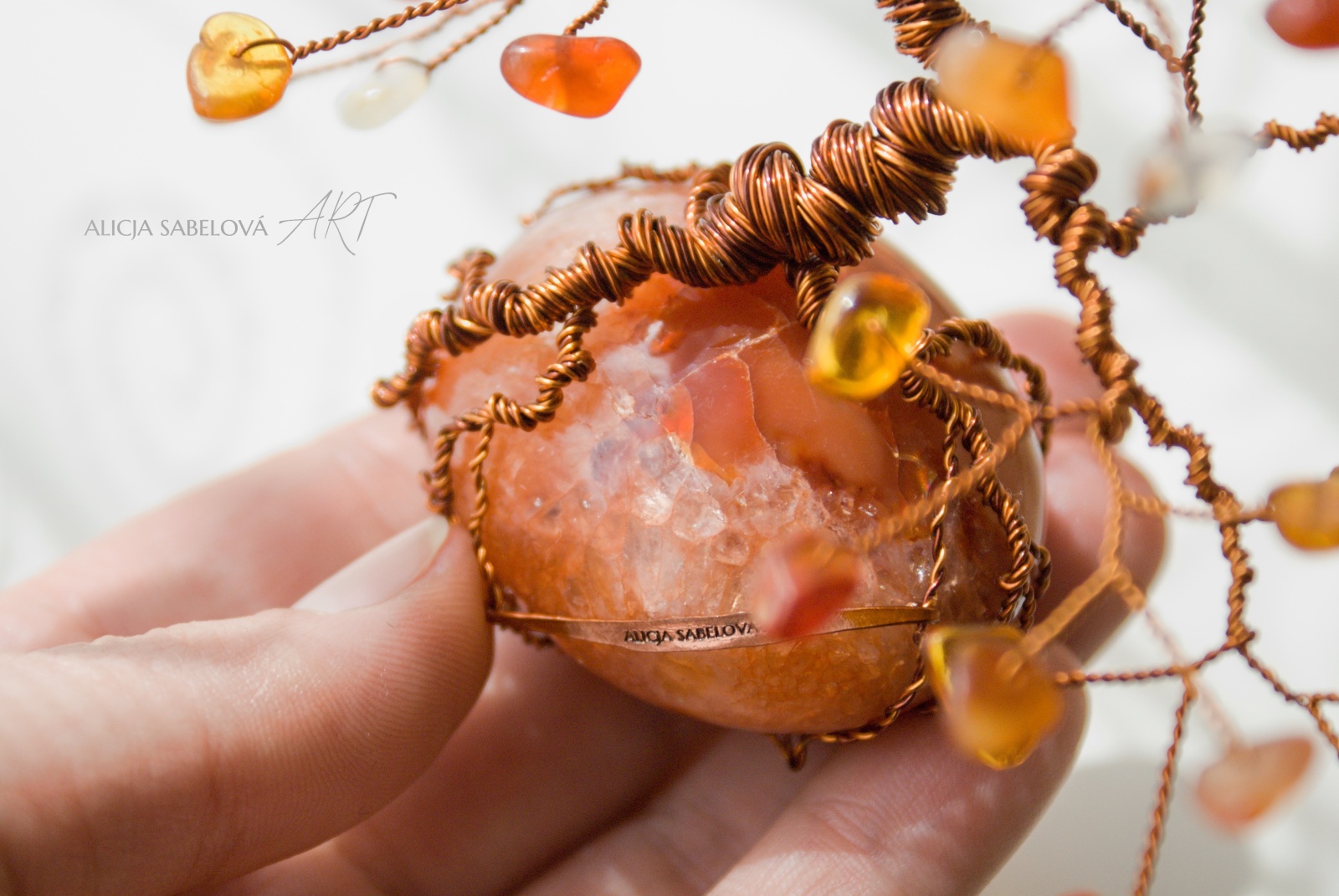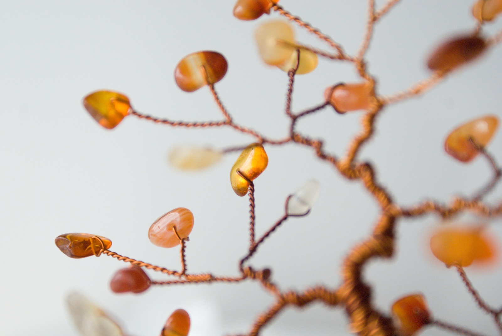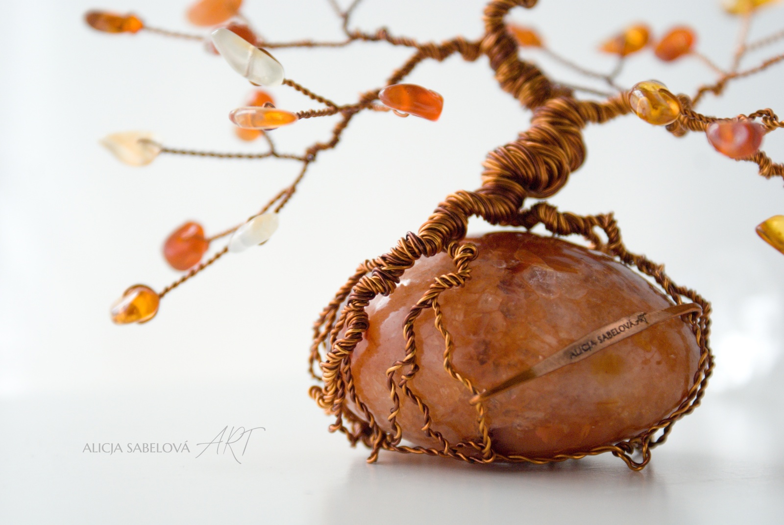 Korunu tvoří Karneol a Jantar. Kmen je vyrobený z měděného drátu, který je lakovaný a nemění tedy barvu.