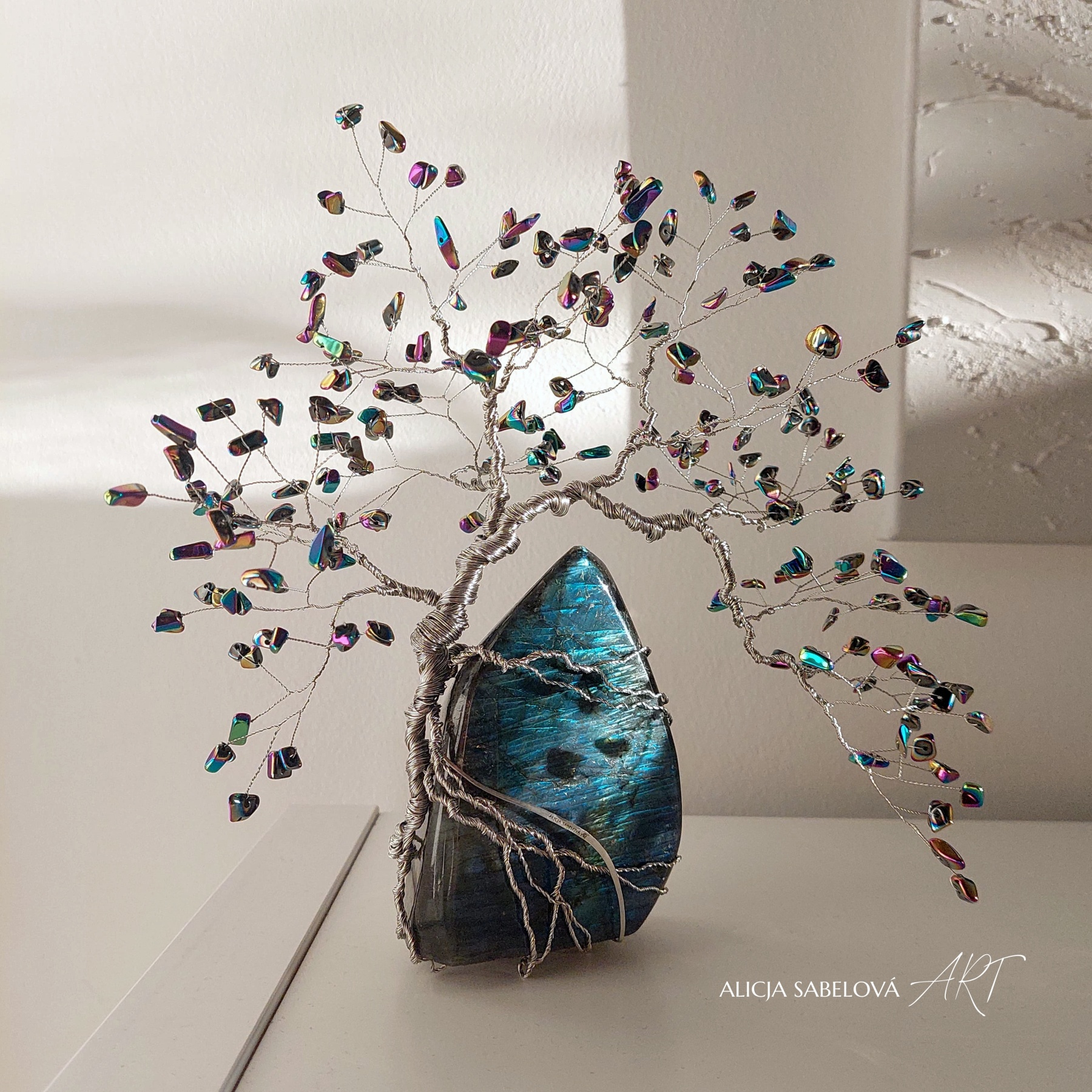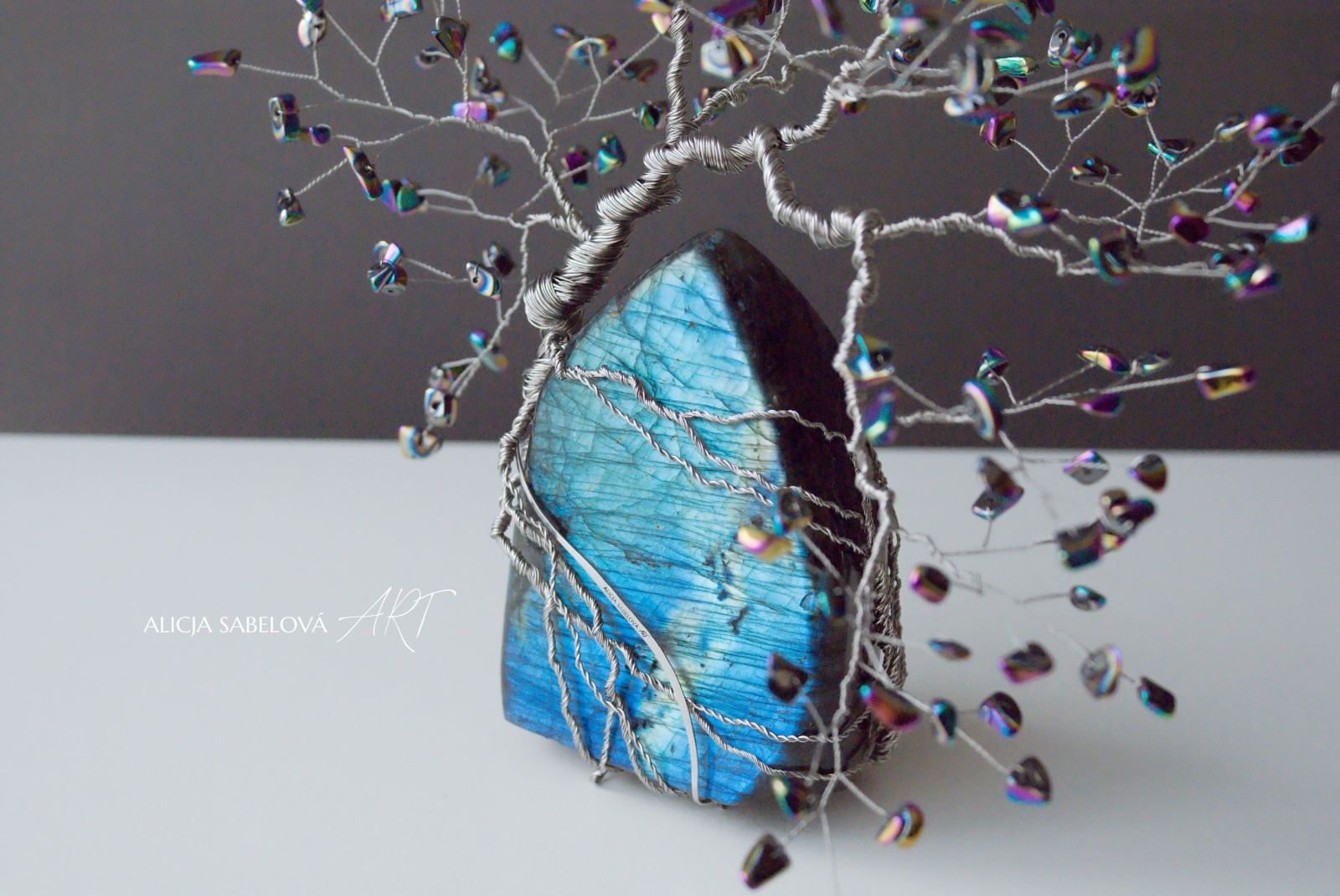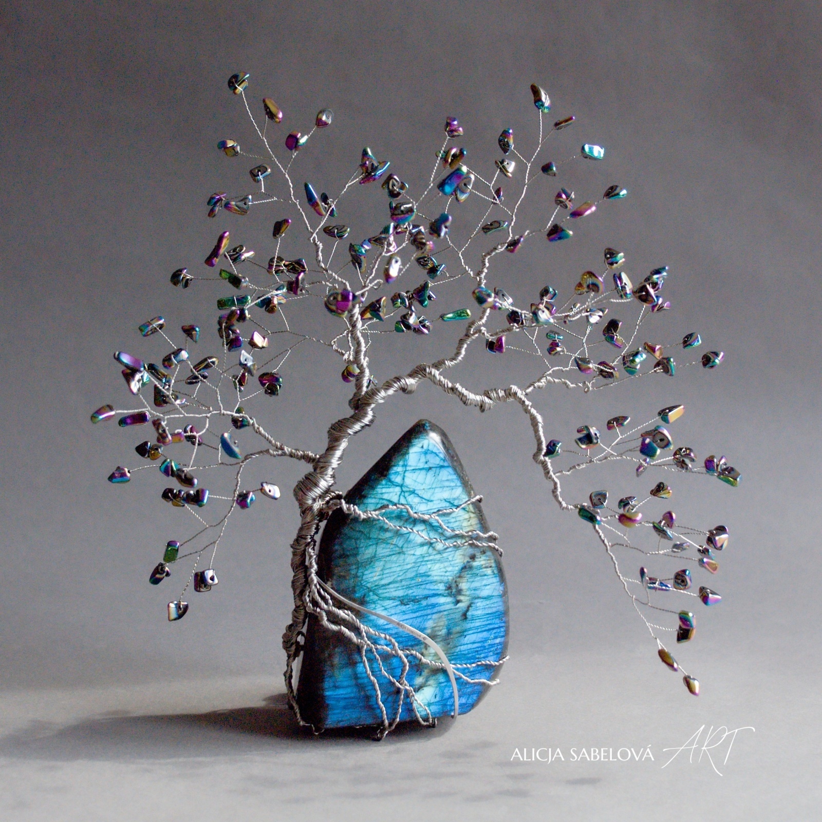 Tento autorský strom z minerálů tvořený podle principu zlatého řezu vyrostl na krásném Labradoritu do výšky 23 cm.