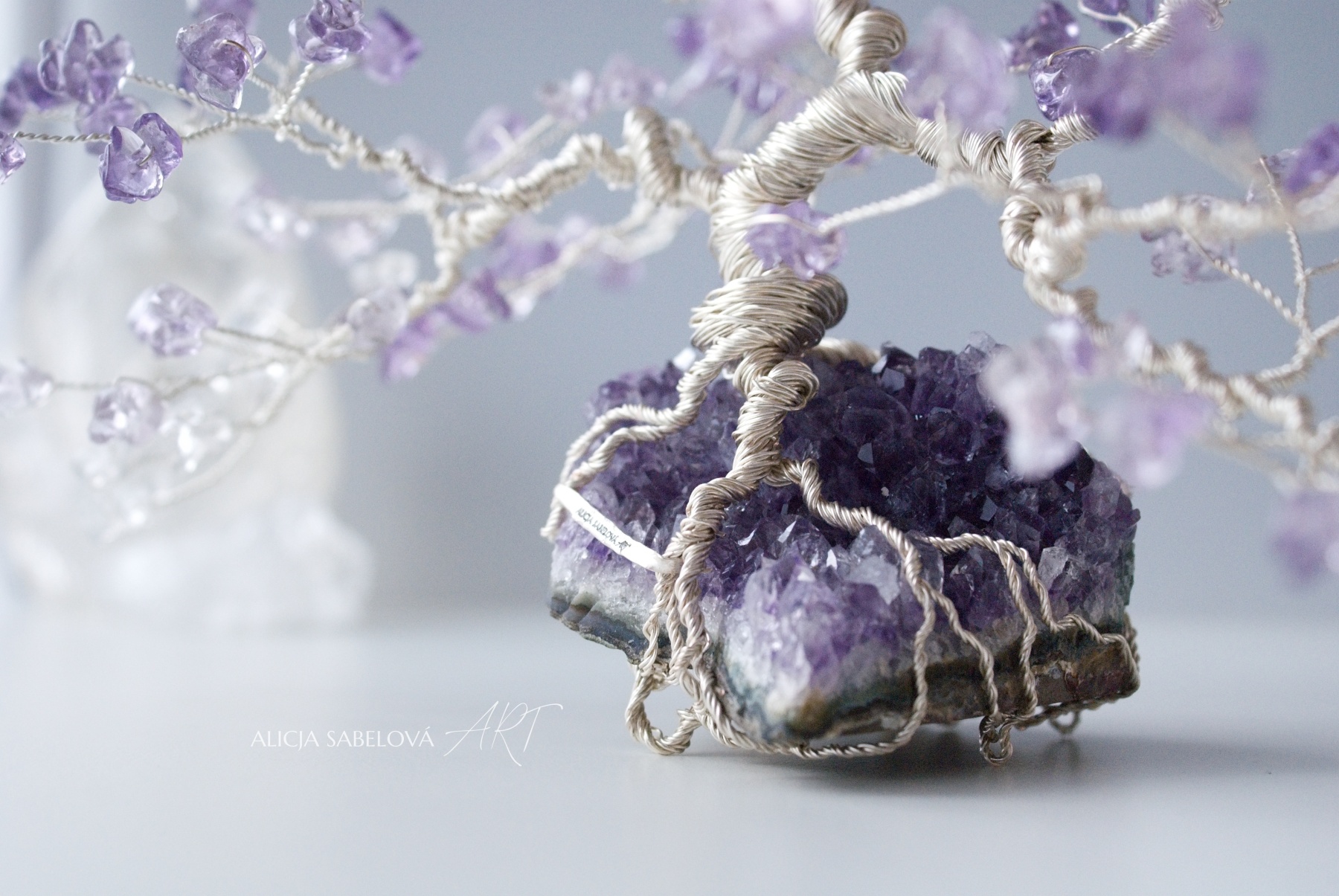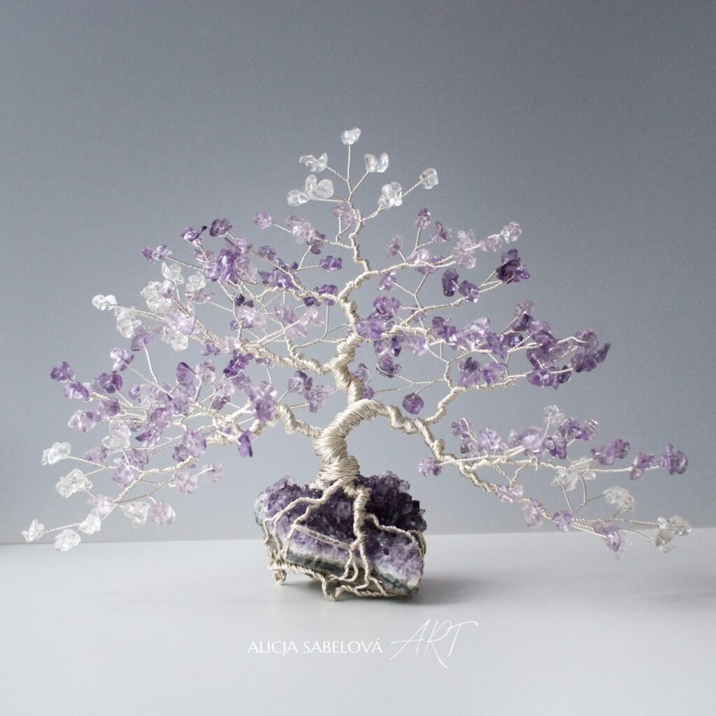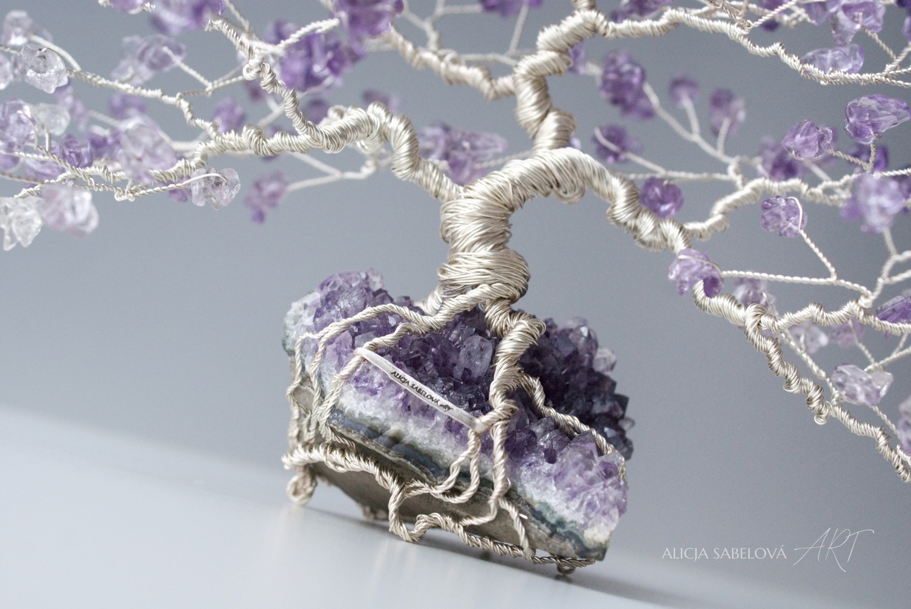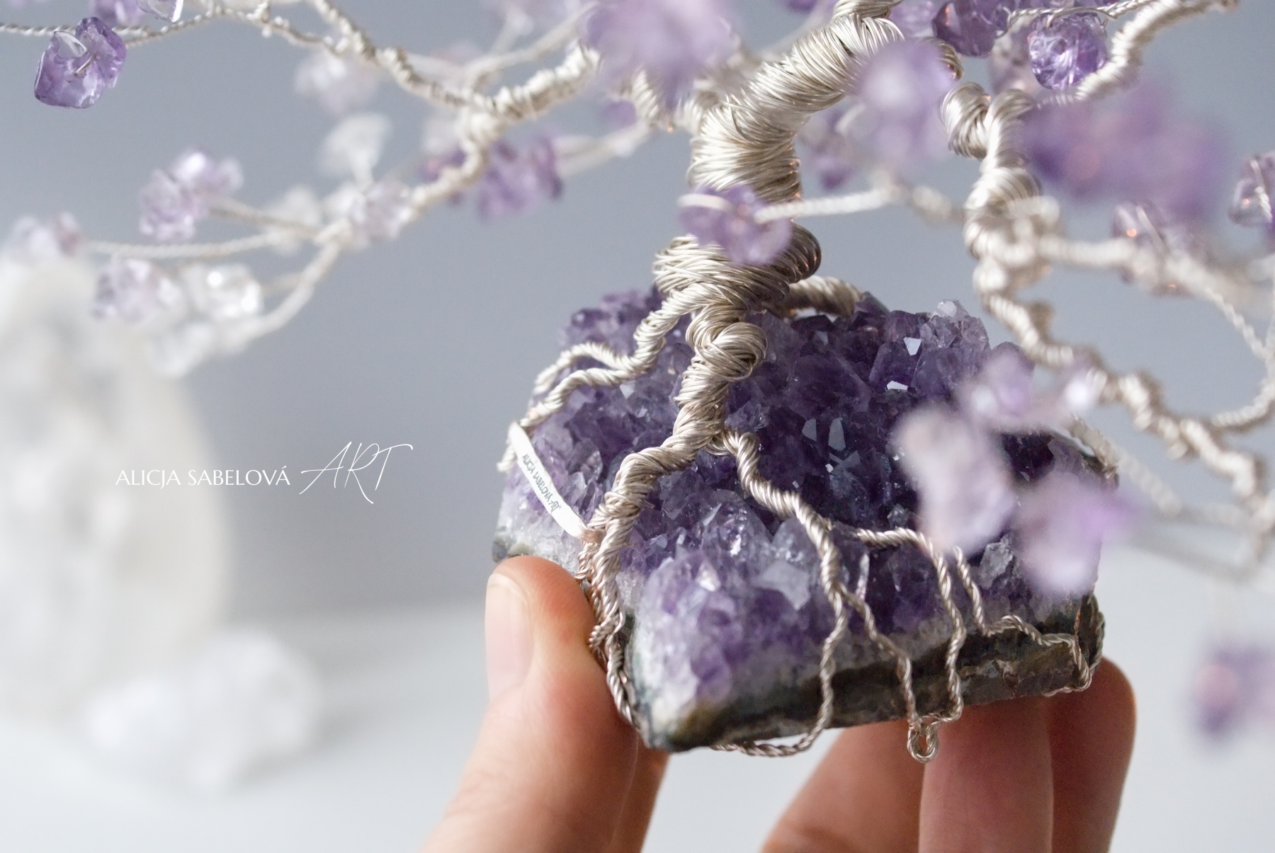 Tento autorský strom z minerálů tvořený podle principu zlatého řezu vyrostl na drúze z Ametystu do výšky 21 cm.