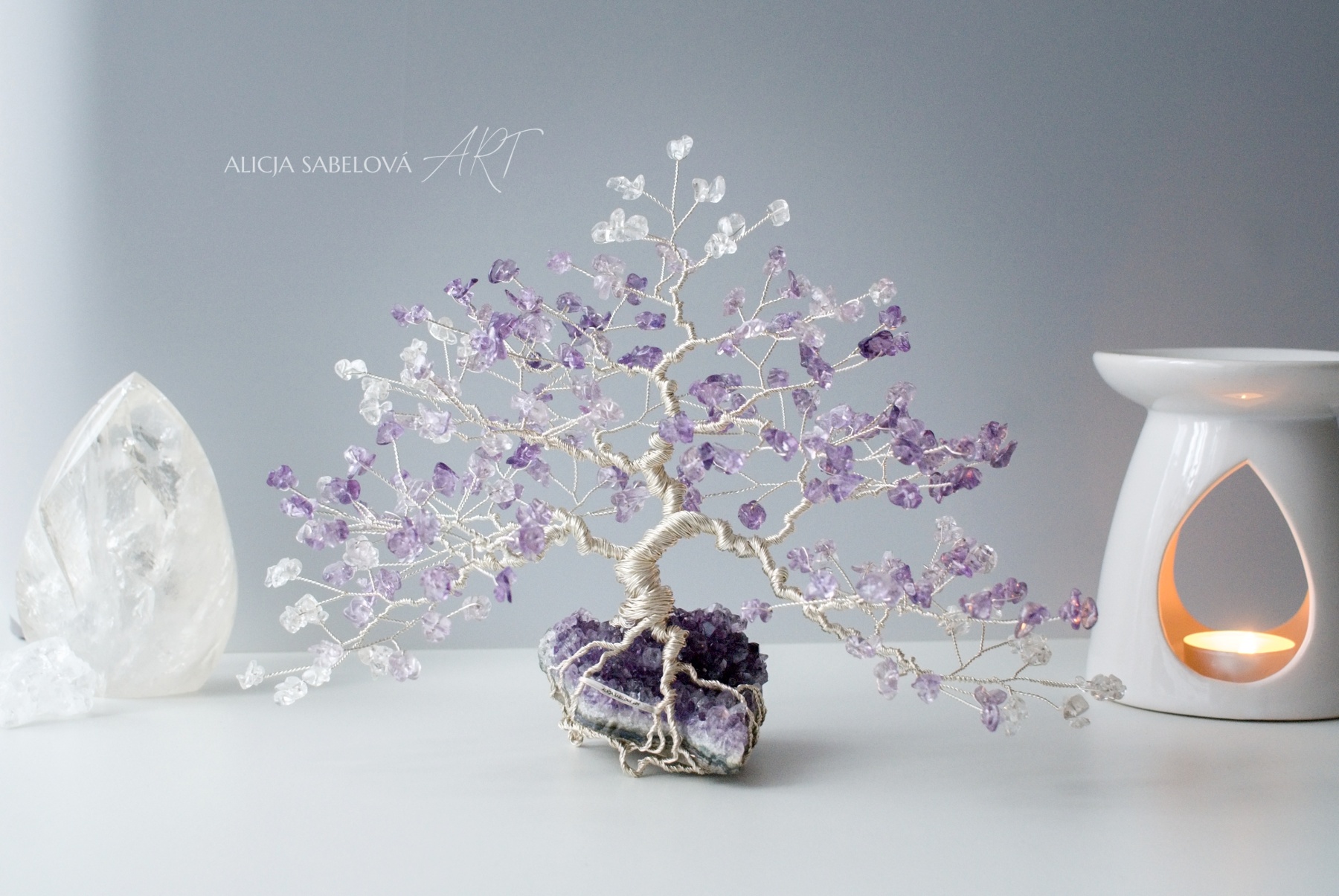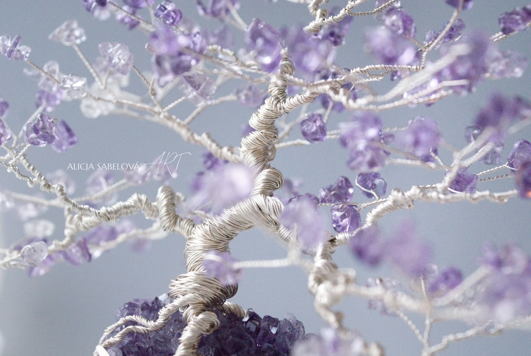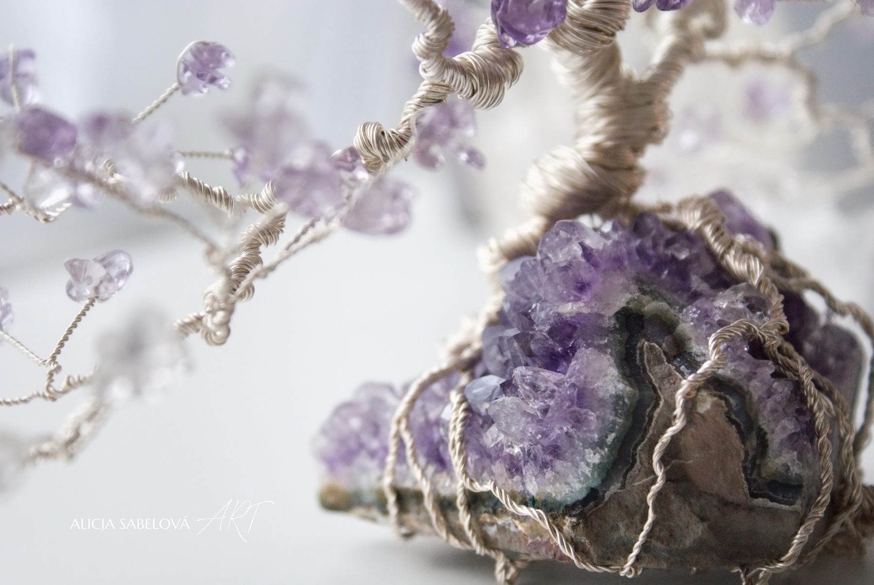 Tento autorský strom z minerálů tvořený podle principu zlatého řezu vyrostl na drúze z Ametystu do výšky 21 cm.