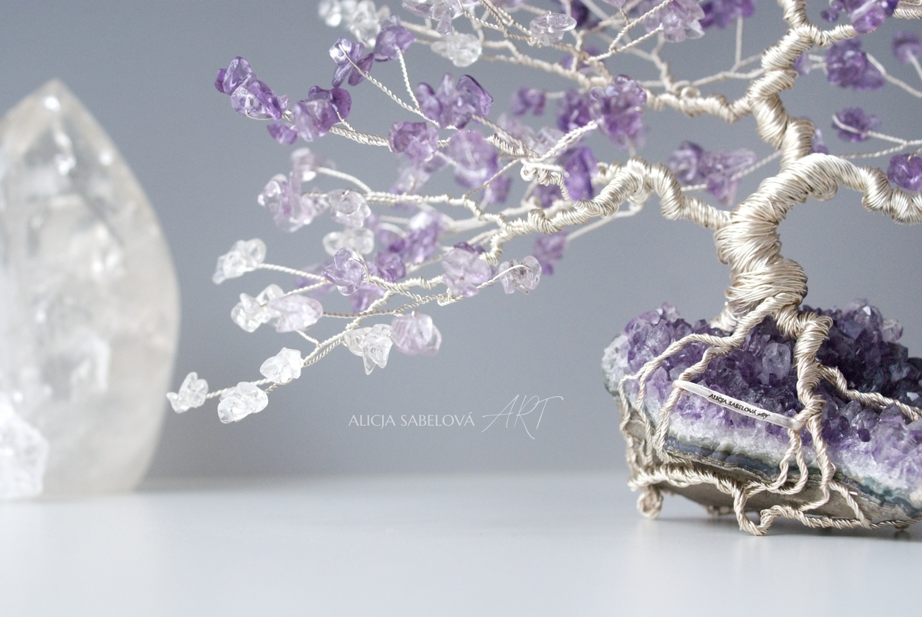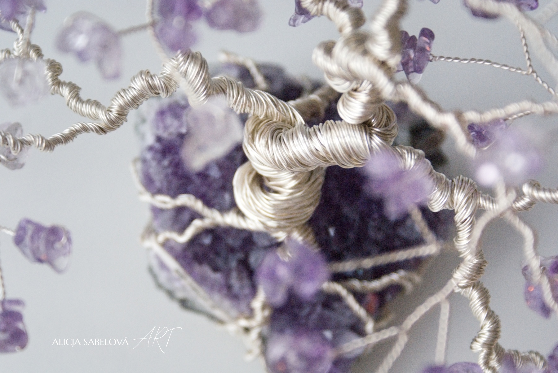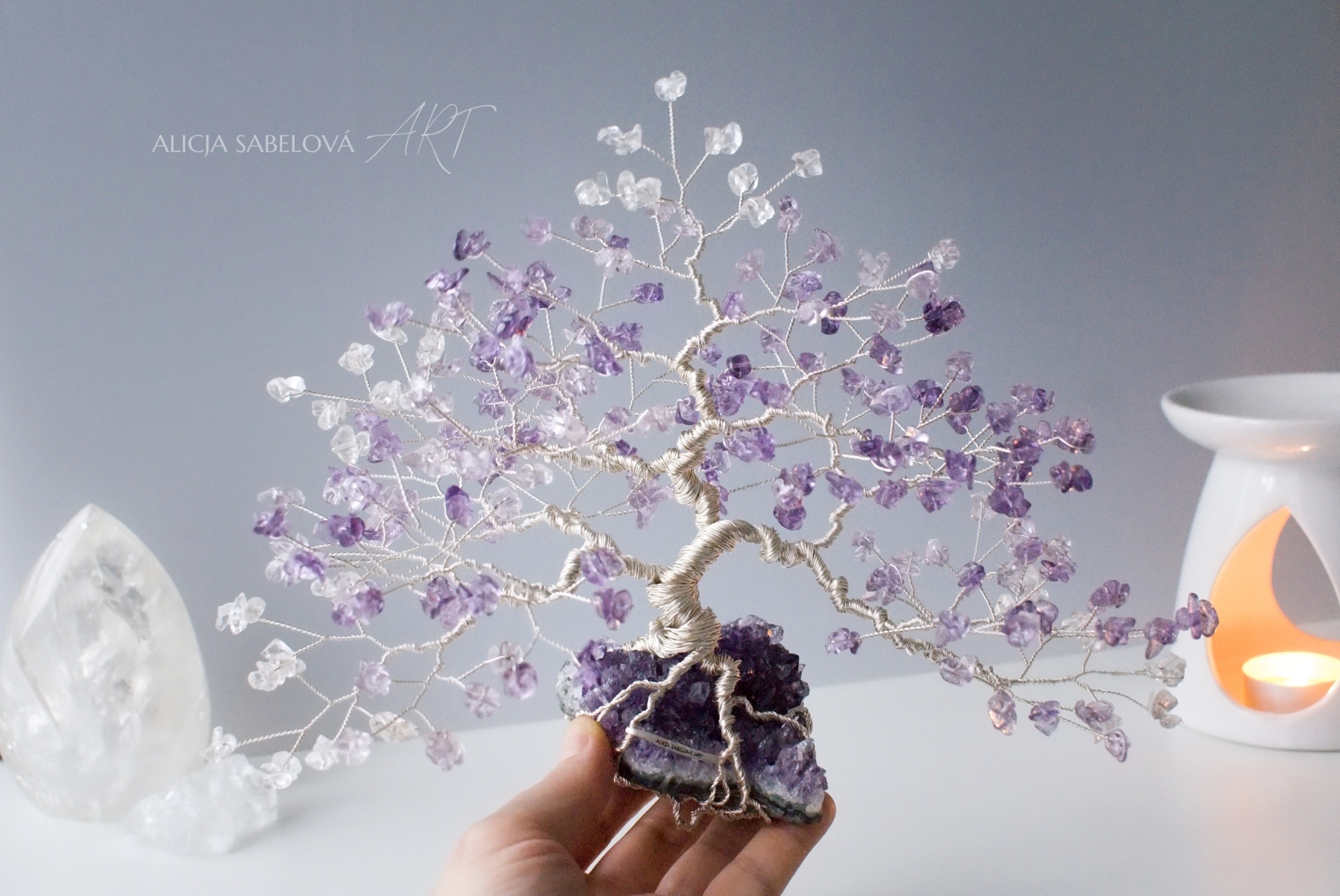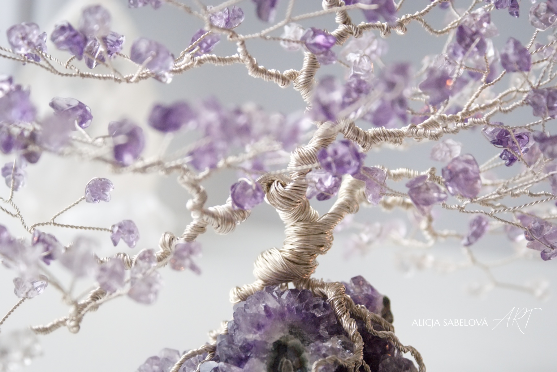 Tento autorský strom z minerálů tvořený podle principu zlatého řezu vyrostl na drúze z Ametystu do výšky 21 cm.