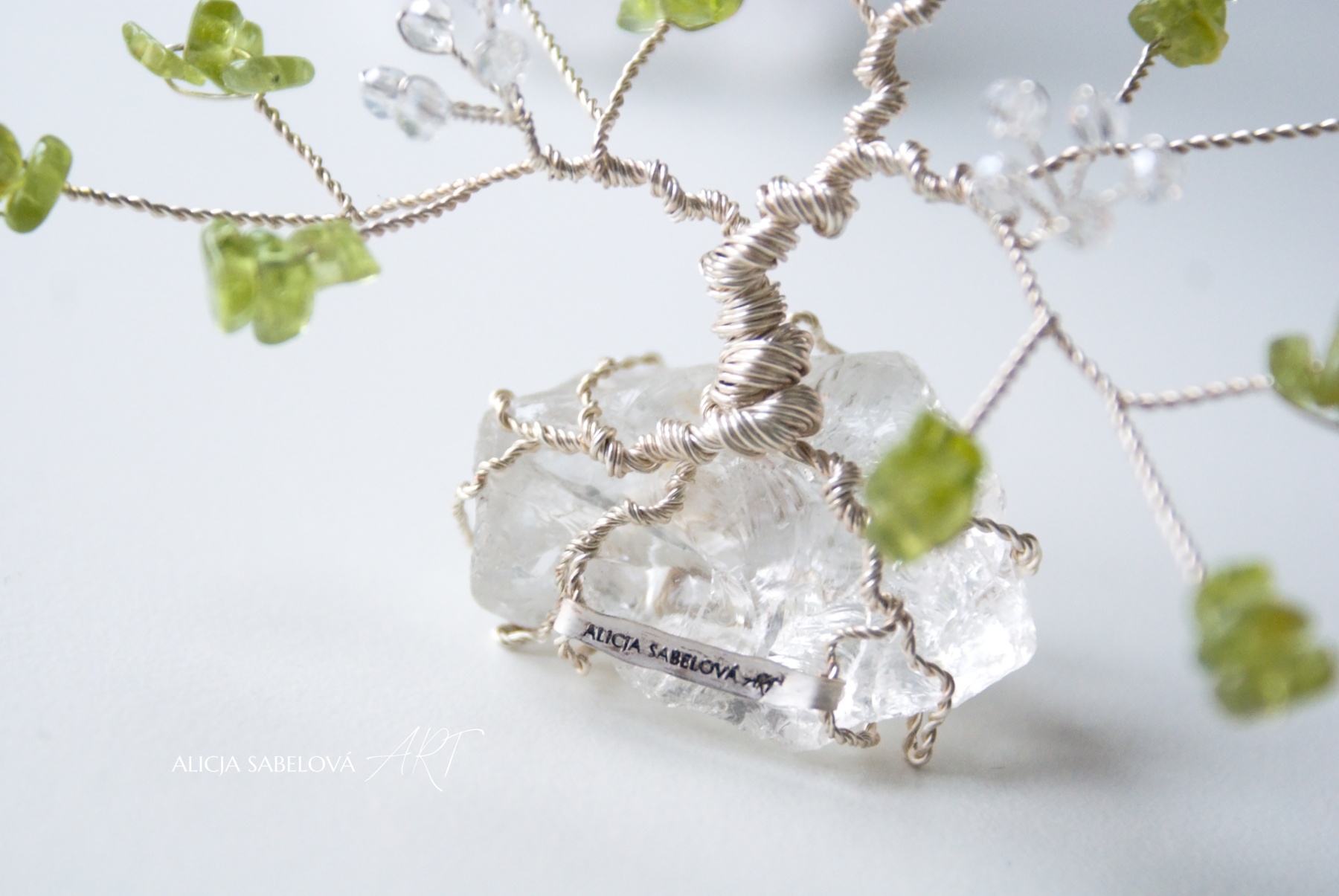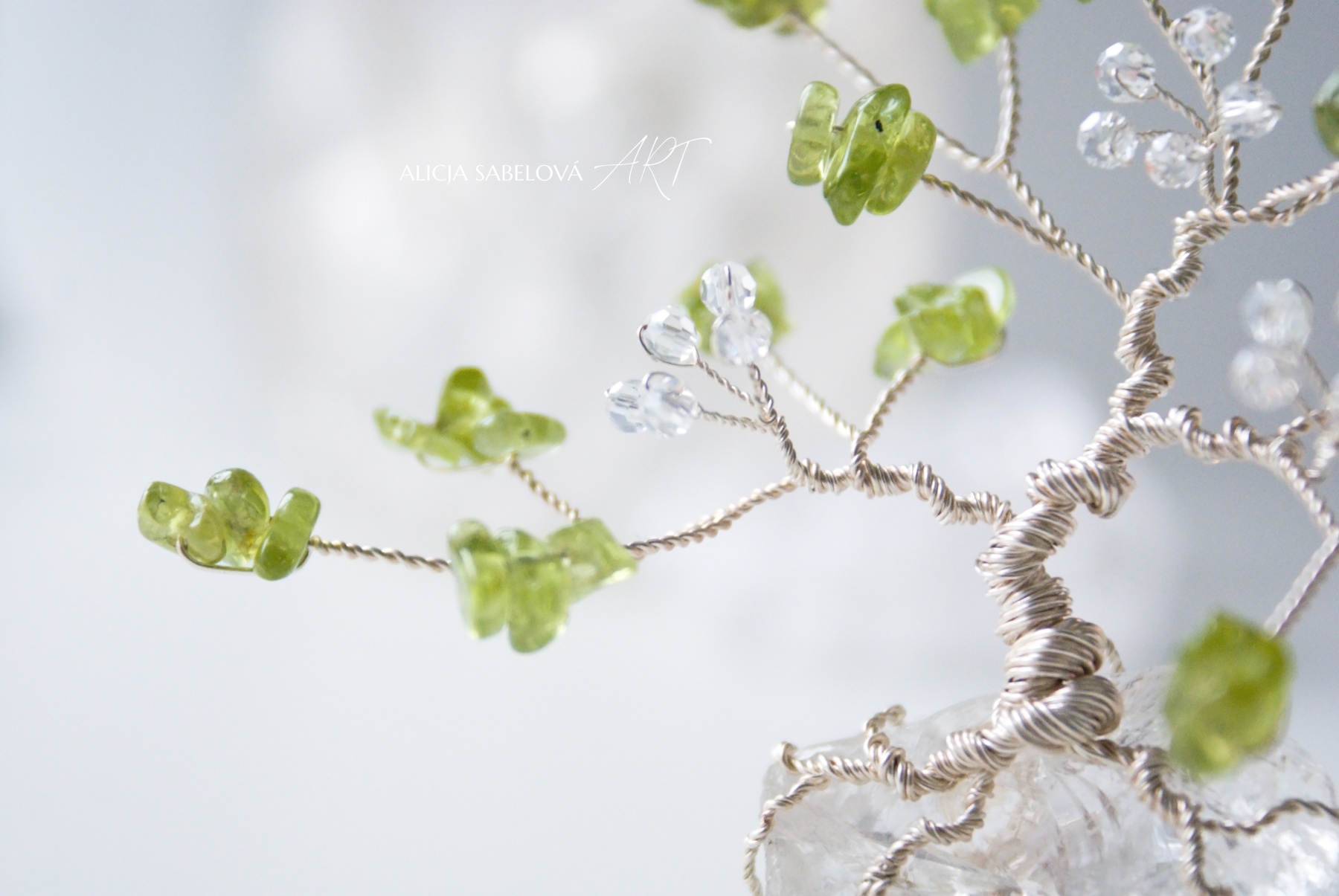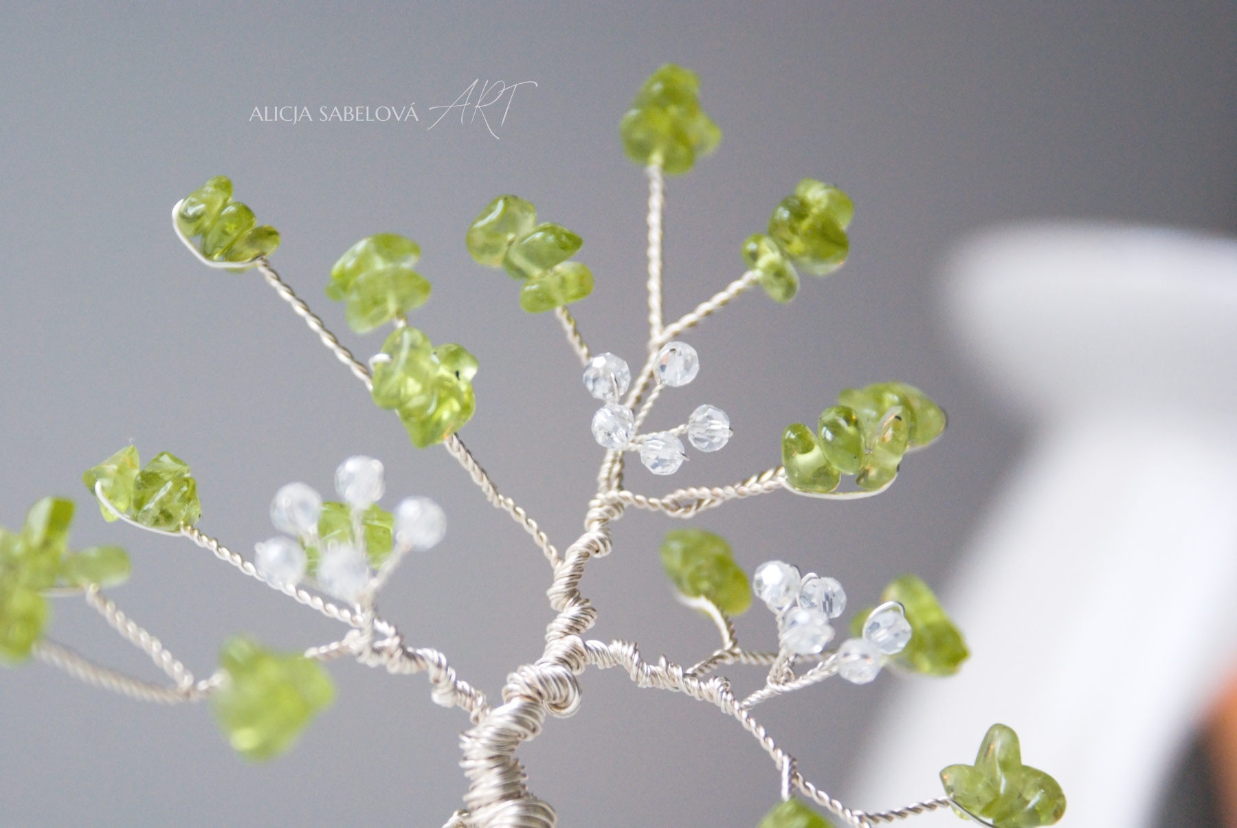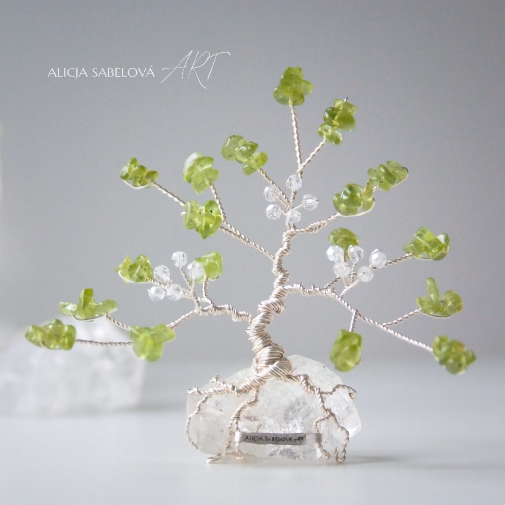 Korunu tvoří kamínky z Olivínu. Kmen je vyrobený z postříbřeného drátu, který je lakovaný a nemění tedy barvu. Stromeček zdobí květy ze skleněných korálků.