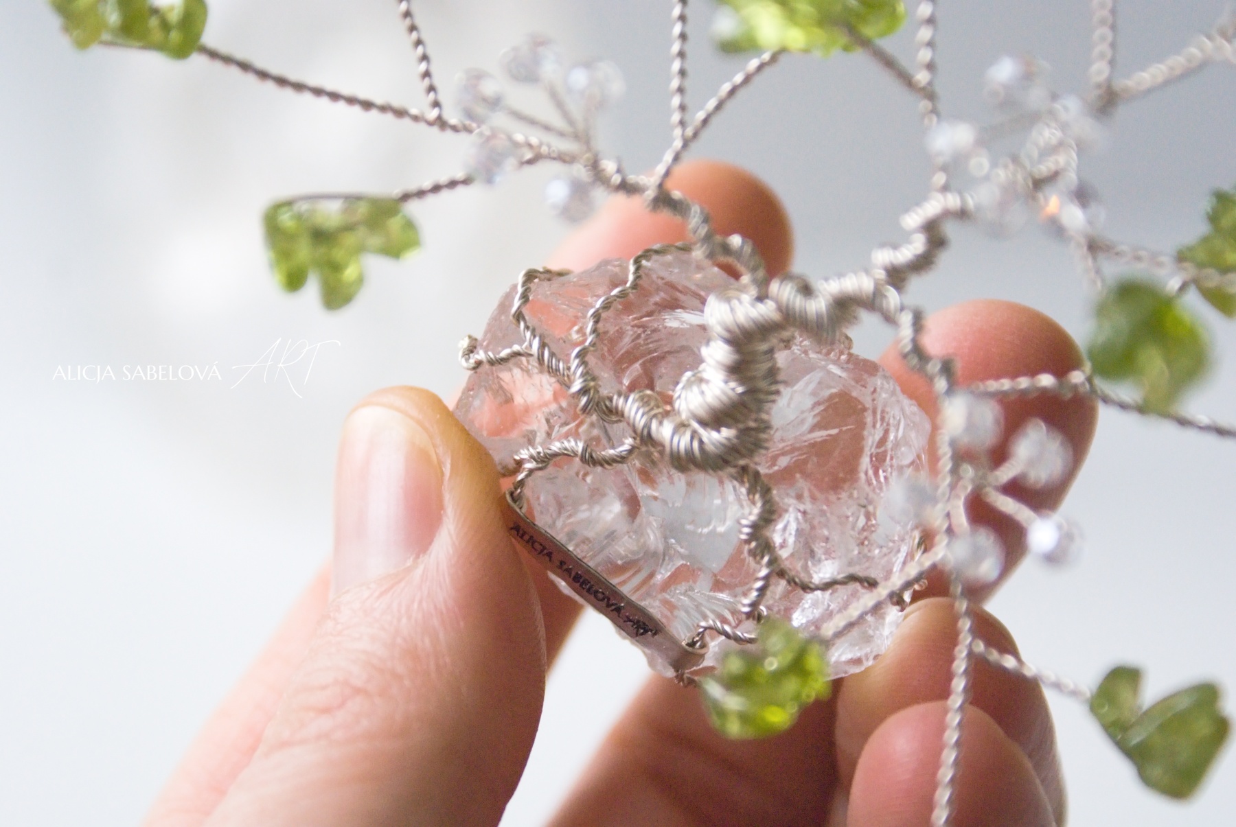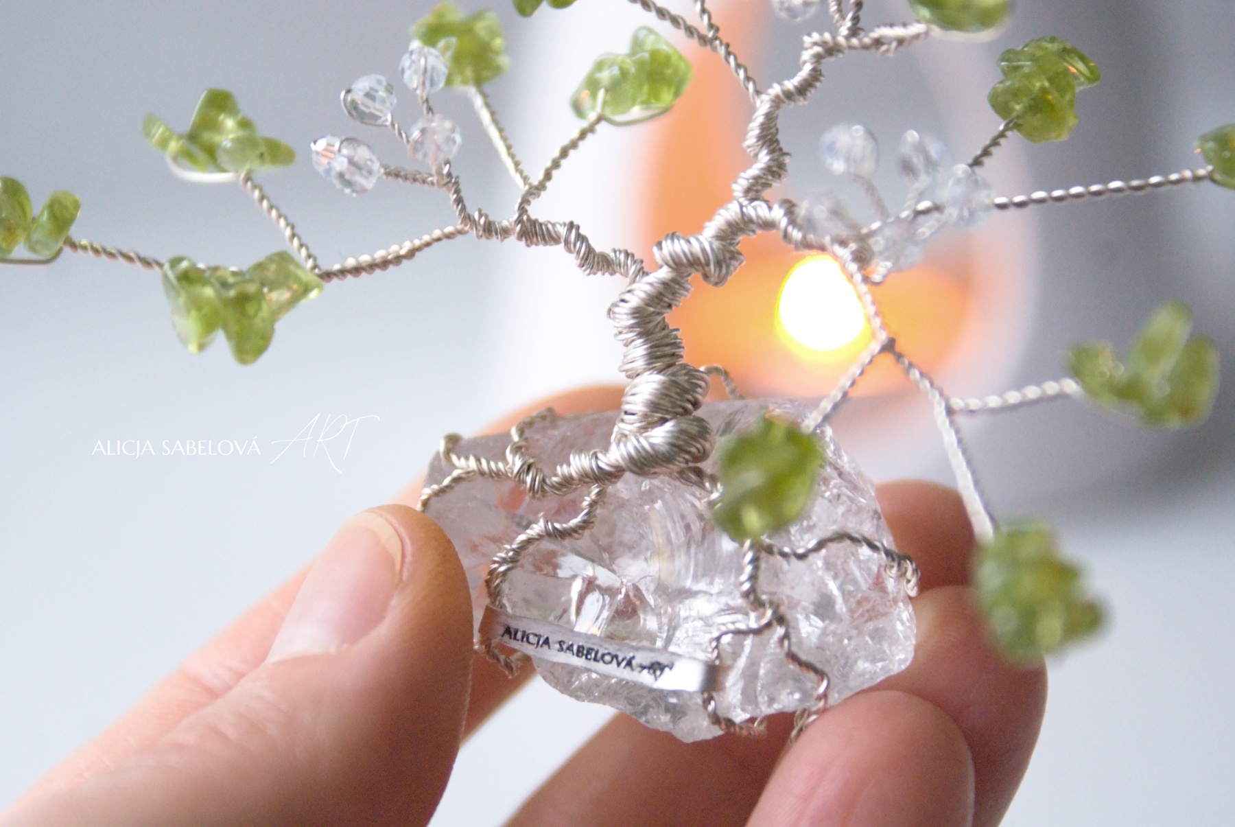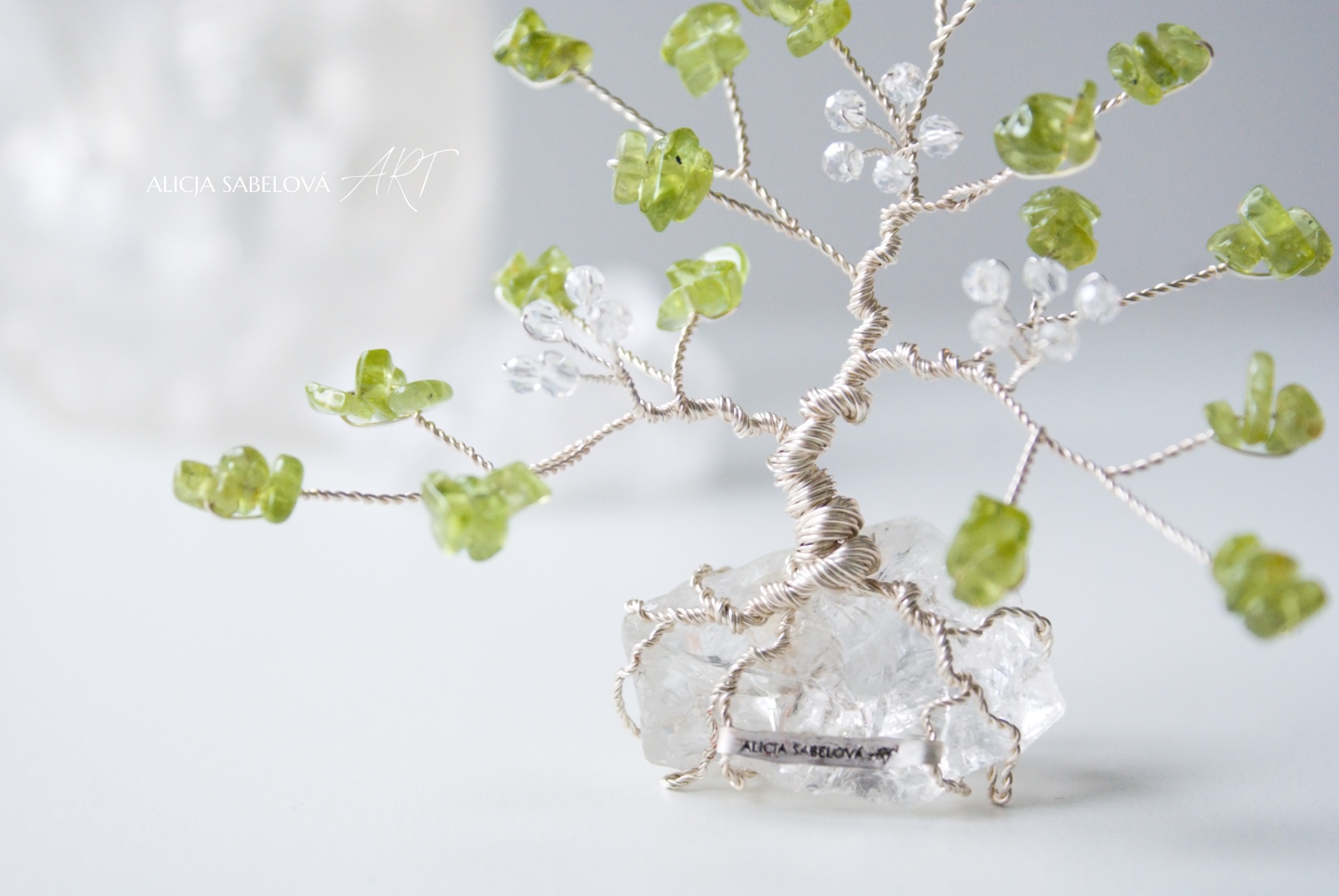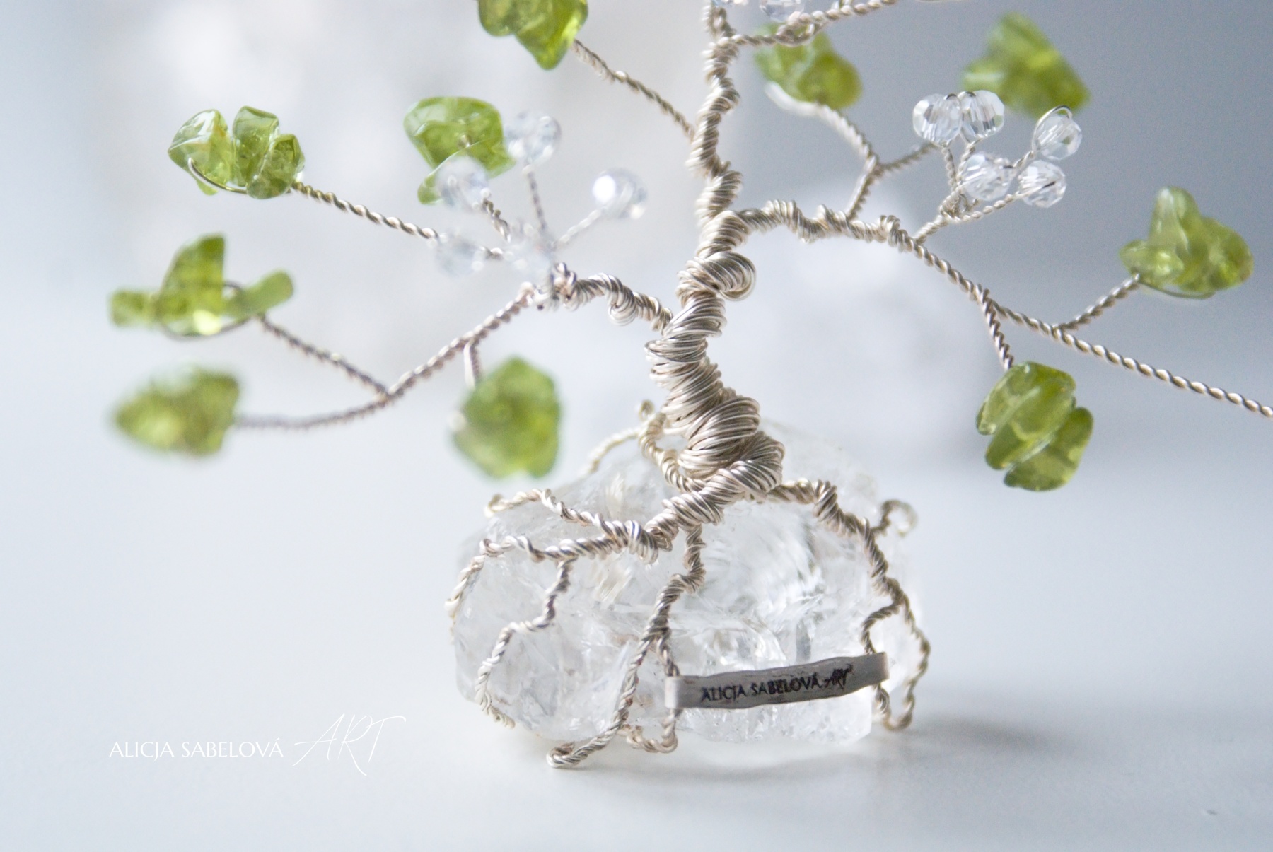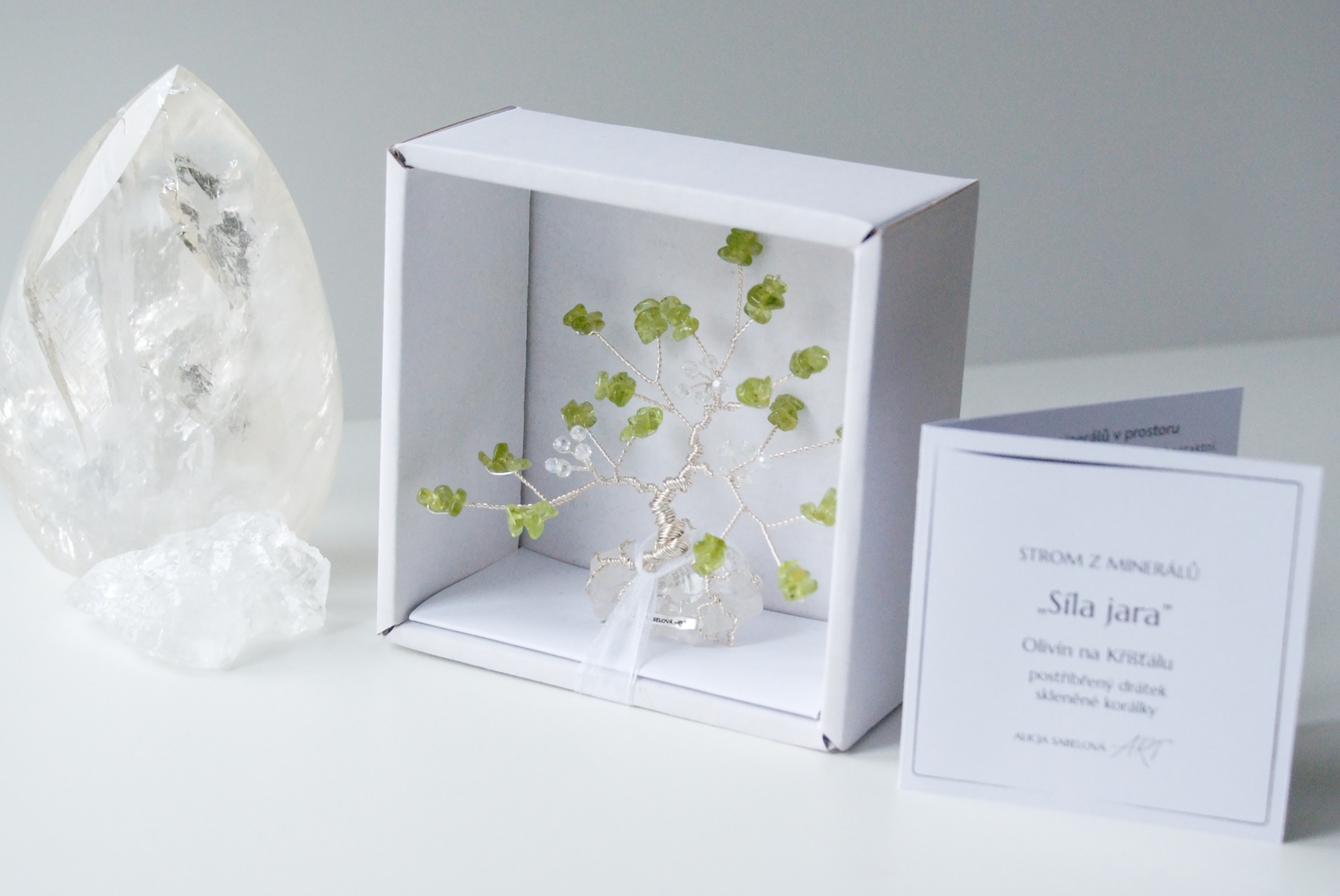 Korunu tvoří kamínky z Olivínu. Kmen je vyrobený z postříbřeného drátu, který je lakovaný a nemění tedy barvu. Stromeček zdobí květy ze skleněných korálků.