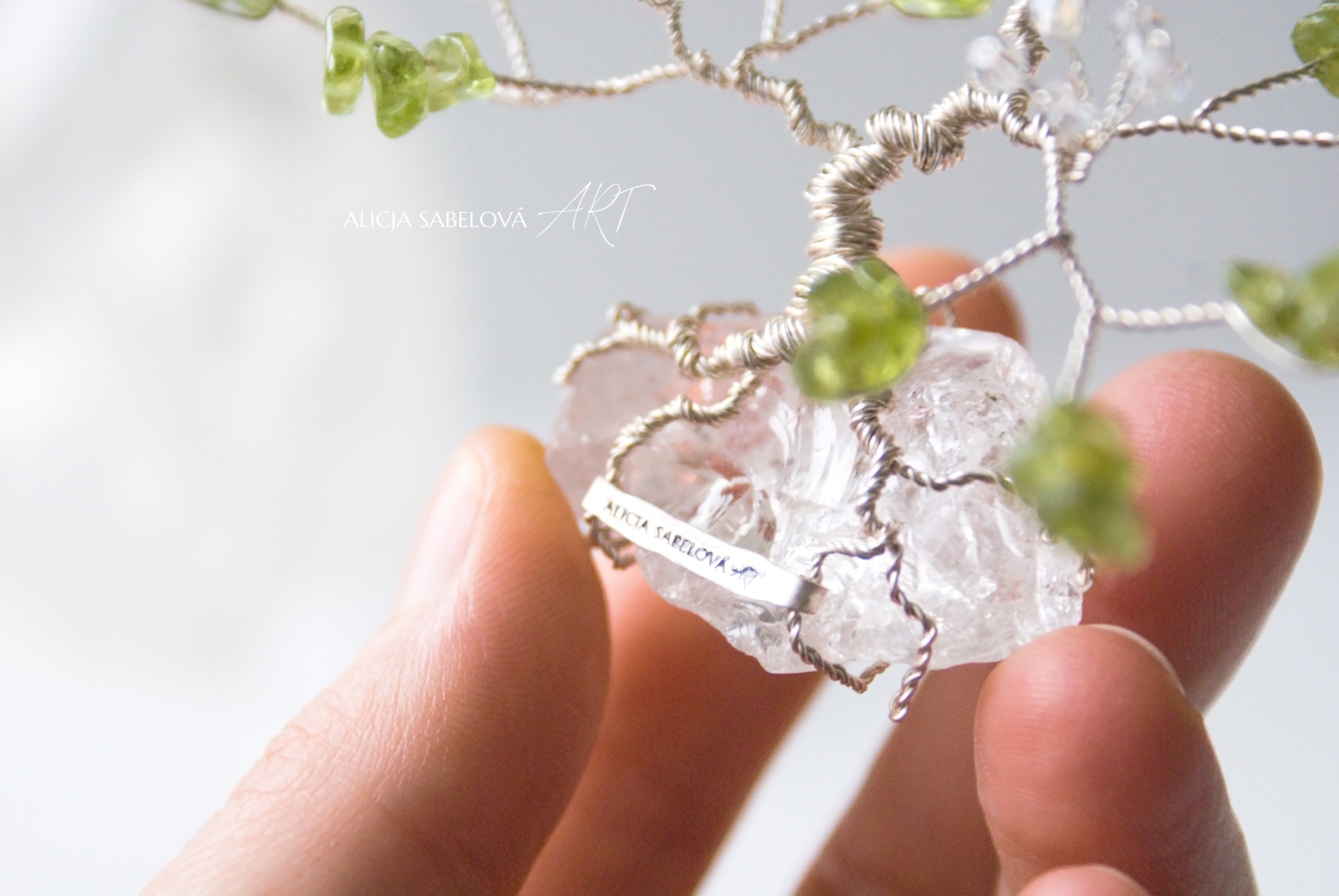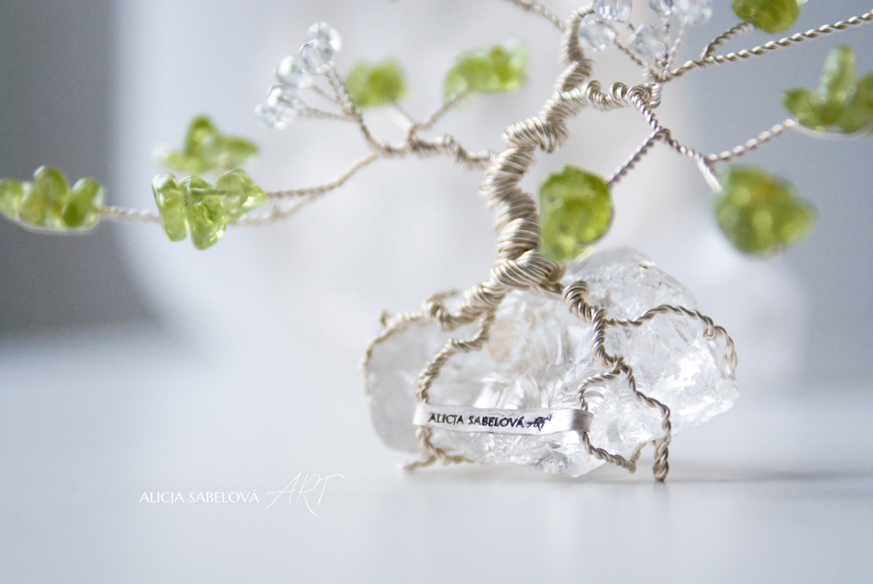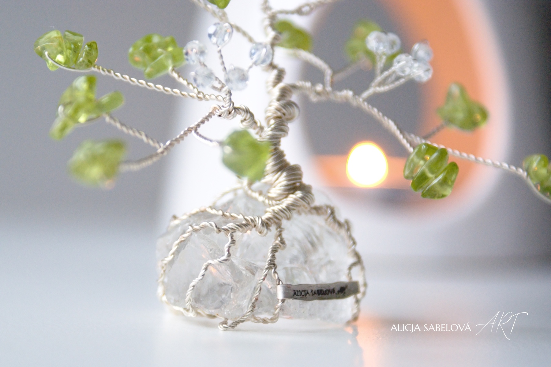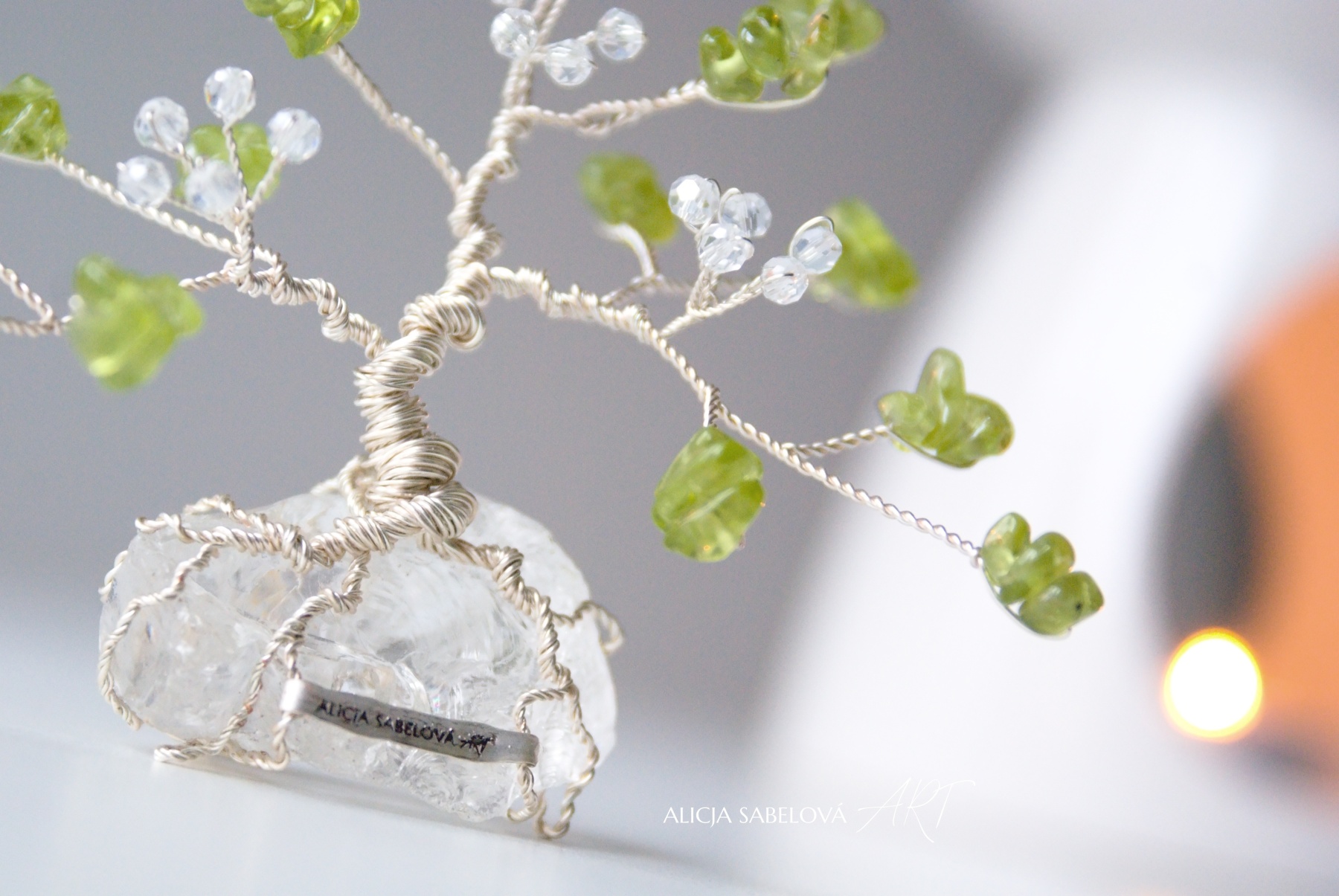 Korunu tvoří kamínky z Olivínu. Kmen je vyrobený z postříbřeného drátu, který je lakovaný a nemění tedy barvu. Stromeček zdobí květy ze skleněných korálků.